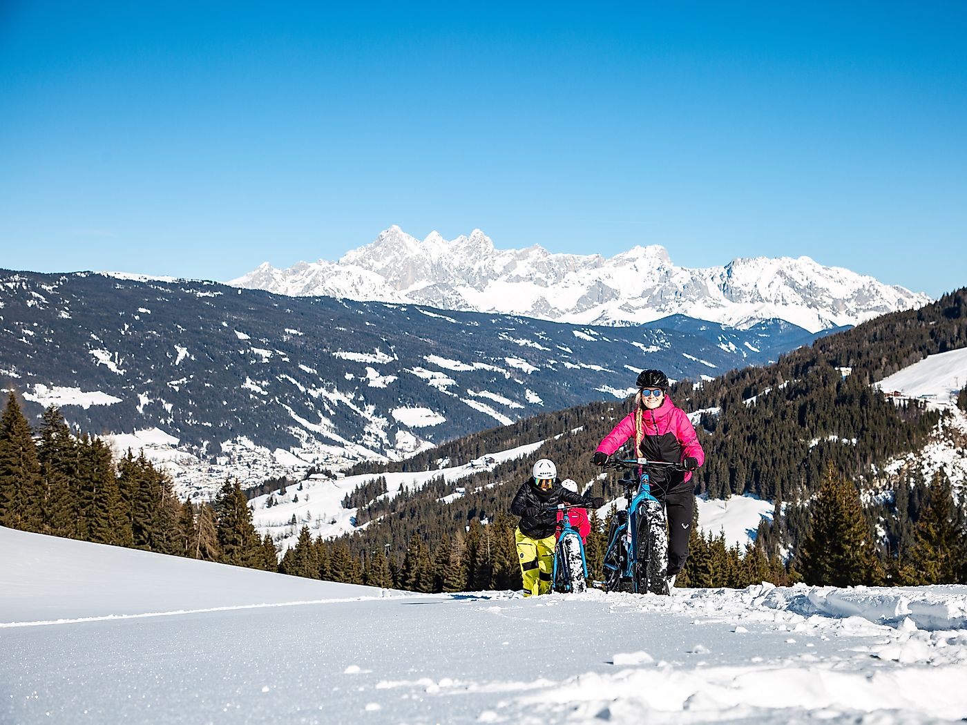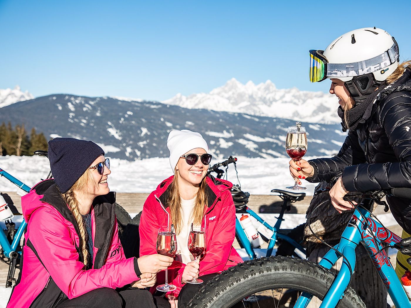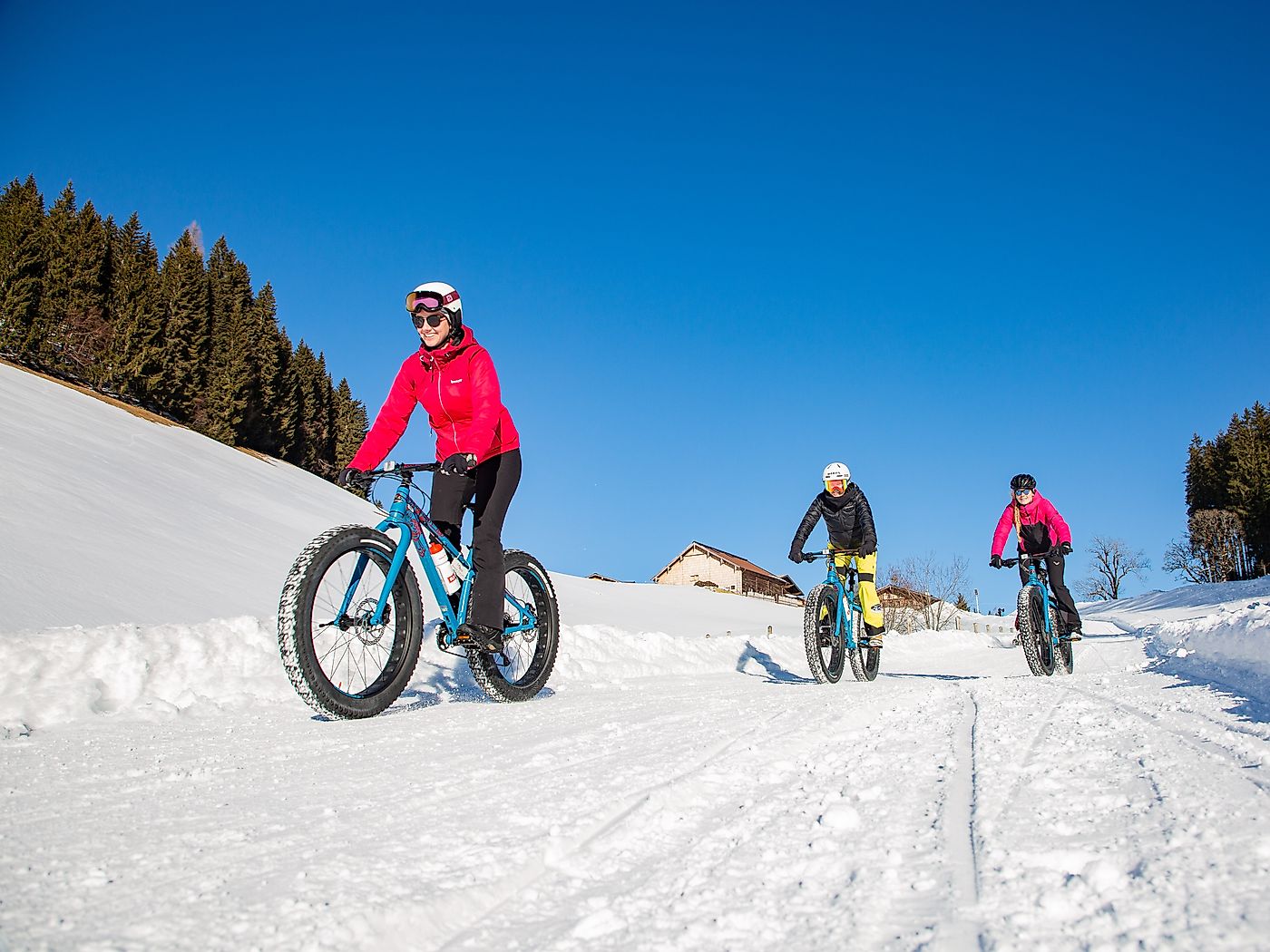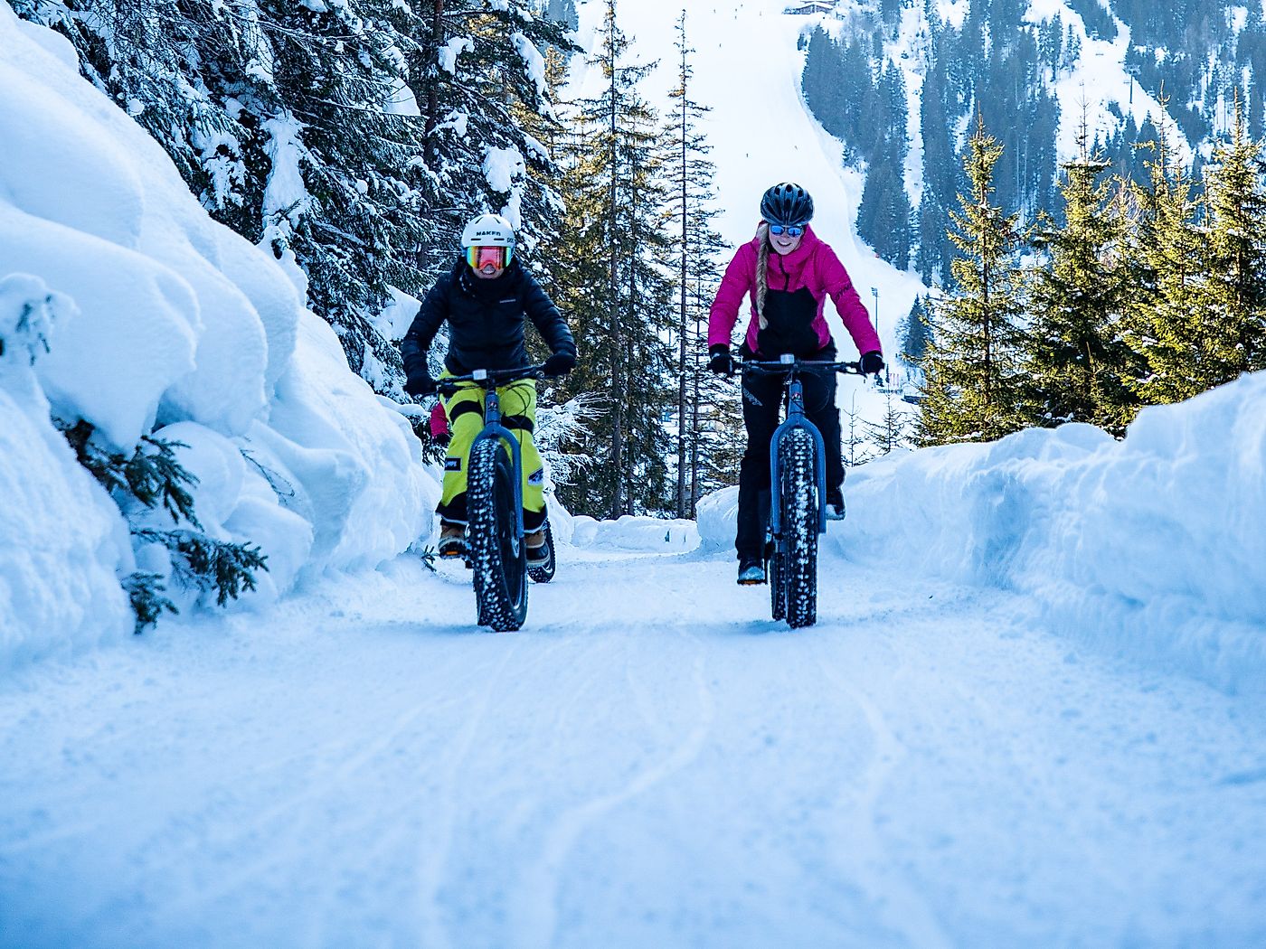 Der lustigste Teil der Tour steht noch bevor. Wir sind schon gespannt, wie uns die Abfahrt mit den Fatbikes über den Schnee gelingt. Wir schnappen unsere Räder und machen uns startklar.