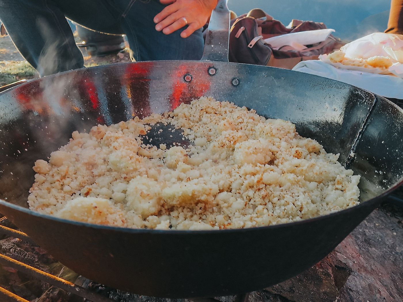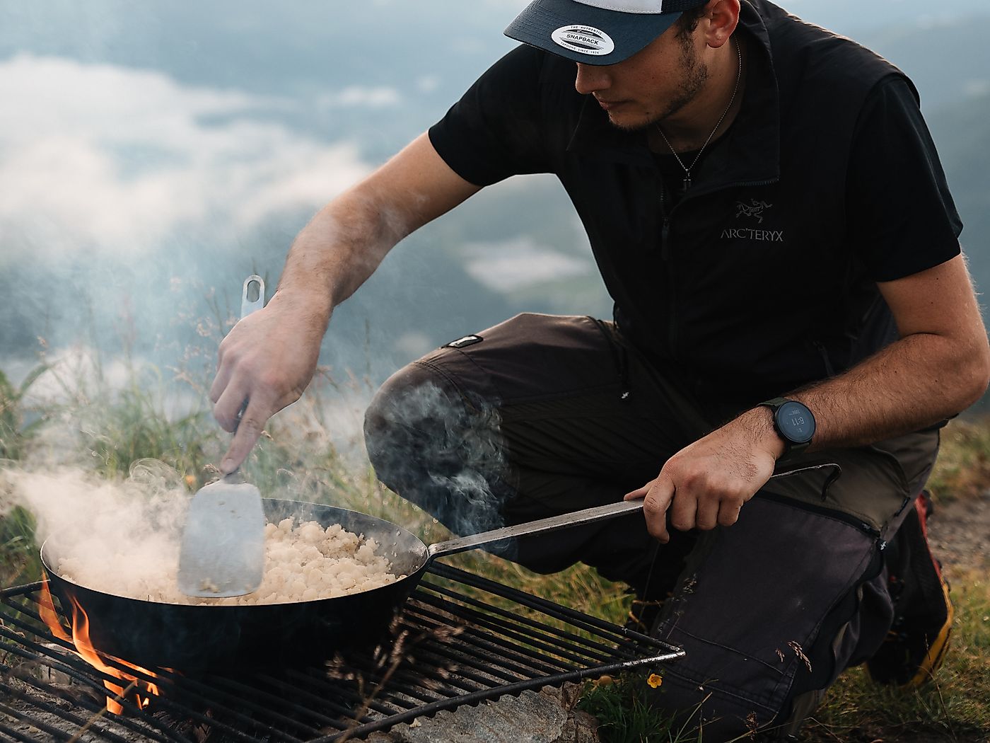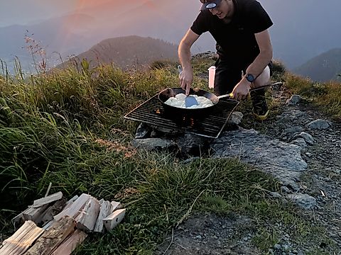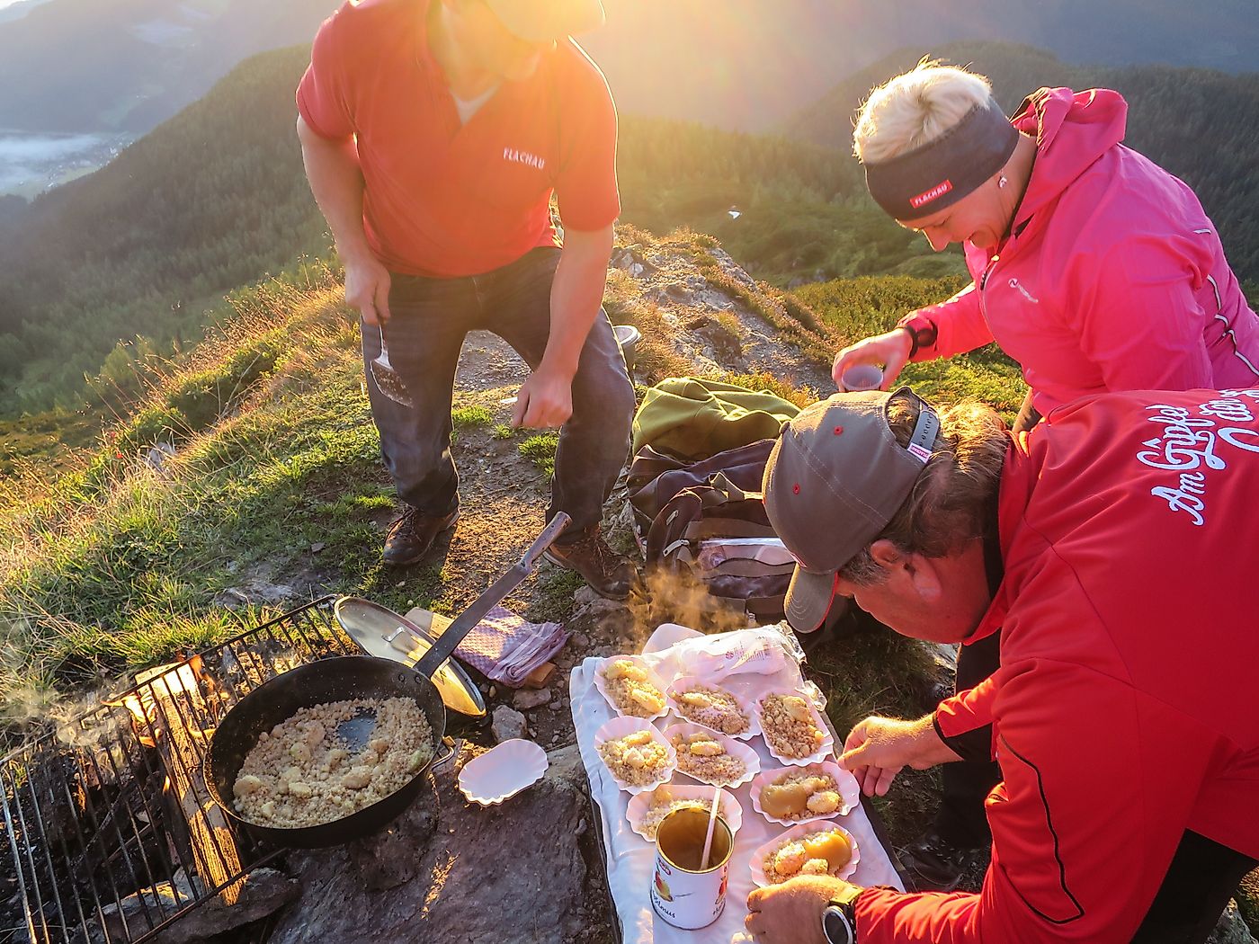 Ein paar Minuten später steht die große, gusseiserne Pfanne auf dem Feuer und Jaggi macht sich an die Zubereitung des Frühstücks. Es gibt Muas, ein traditionelles Gericht aus der Region, das früher von Sennerinnen und Holzknechten zubereitet wurde. Die Gründe dafür liegen auf der Hand: Die Mischung aus Mehl, Salz, Wasser und Butterschmalz ist schnell zubereitet, schmeckt gut und gibt jede Menge Energie für den Tag. Genau was Bergsteiger brauchen, denke ich. „Ein echtes Kraftfutter“, sagt Jaggi zu uns und grinst. Bei einigen meiner Bergkameraden kommen nostalgische Gefühle hoch. „Das habe ich das letzte Mal bei meiner Oma gegessen“, erzählt mir Elisabeth, eine waschechte Flachauerin. Zum Abschluss verfeinert Jaggi das Muas mit frischen Schwarzbeeren. Ich nehme einen Teller, mache es mir zwischen zwei Felsen bequem und lasse es mir schmecken. Herrlich!