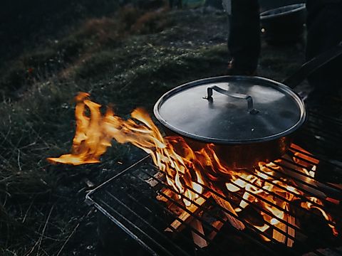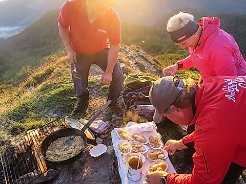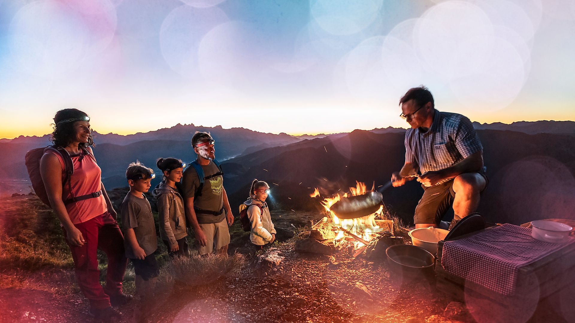 Geschafft! Ich kraxle die letzten Meter über Felsen zum Gipfelkreuz hoch und schaue in die Ferne. Das Morgengrauen verwandelt sich langsam in ein oranges Leuchten. Die Wolken am Horizont scheinen zu brennen. Für Jaggi beginnt jetzt die eigentliche Arbeit. Auf einer kleinen, rußigen Feuerstelle bringt er Holzspäne zum Brennen und legt dann dicke Holzscheite darauf. Ich lausche dem Knistern und Knacken des Lagerfeuers, als Jaggi mir eine Tasse heißen Kaffee reicht. Was für ein Morgen!
