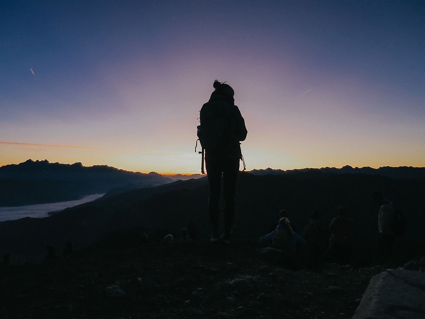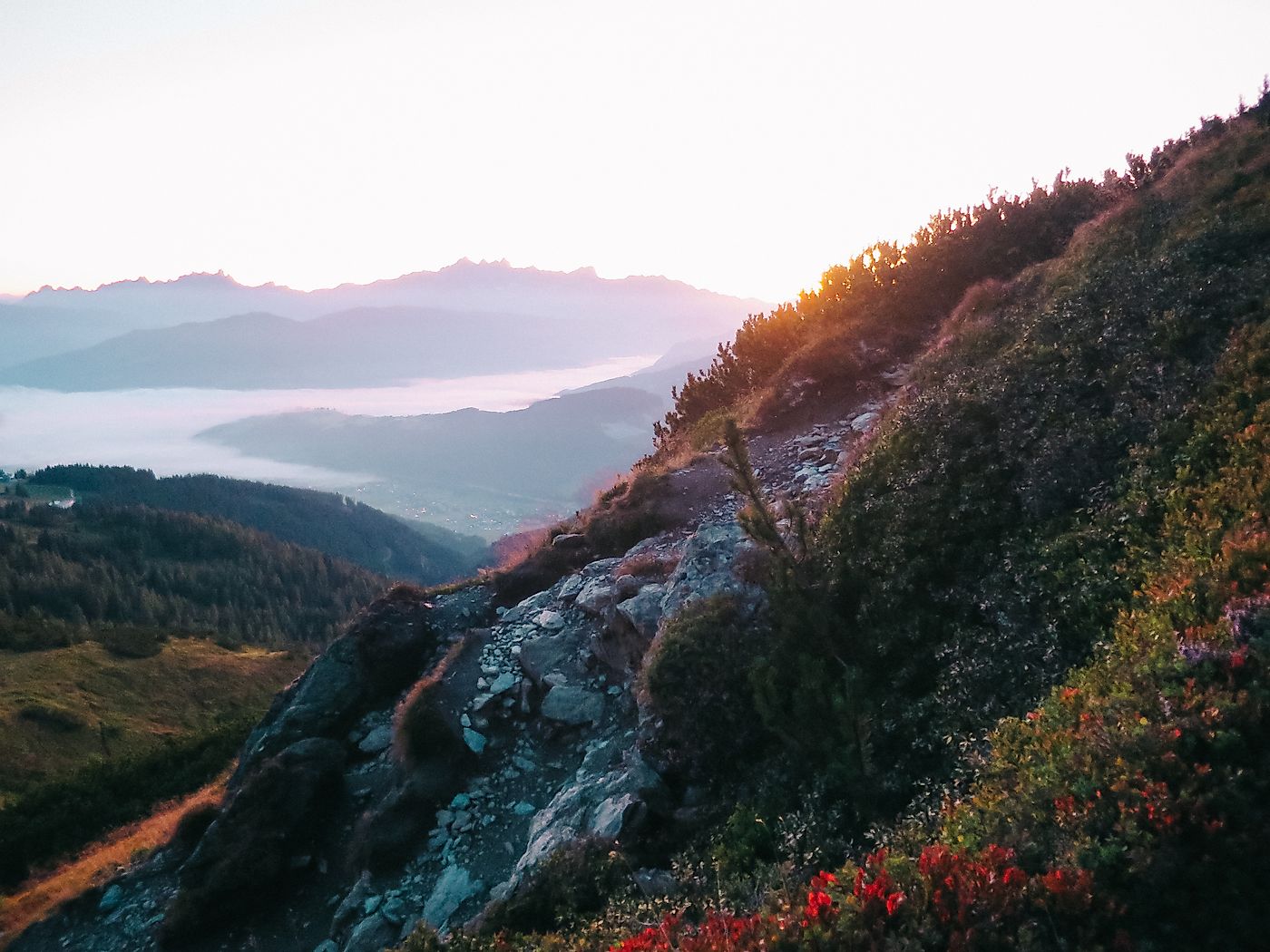Unser Shuttle bringt uns über schmale Bergstraßen bis zur Kogelalm. Hier, wo sich im Winter die Skifahrer über breite Pisten ins Tal schwingen, befindet sich im Sommer ein wunderschönes Almgebiet. Ein paar Kuhglocken und sanfter Wind, sonst ist nichts zu hören – bis auf Jaggis Lachen, der mit den anderen Frühaufstehern scherzt und zum Aufbruch drängt. Der Sonnenaufgang wartet schließlich nicht auf trödelnde Wandersleut’! Im Licht der Stirnlampe bricht sich mein Atem. Ich ziehe den Reißverschluss meiner Jacke bis unter das Kinn. Dann geht es los.