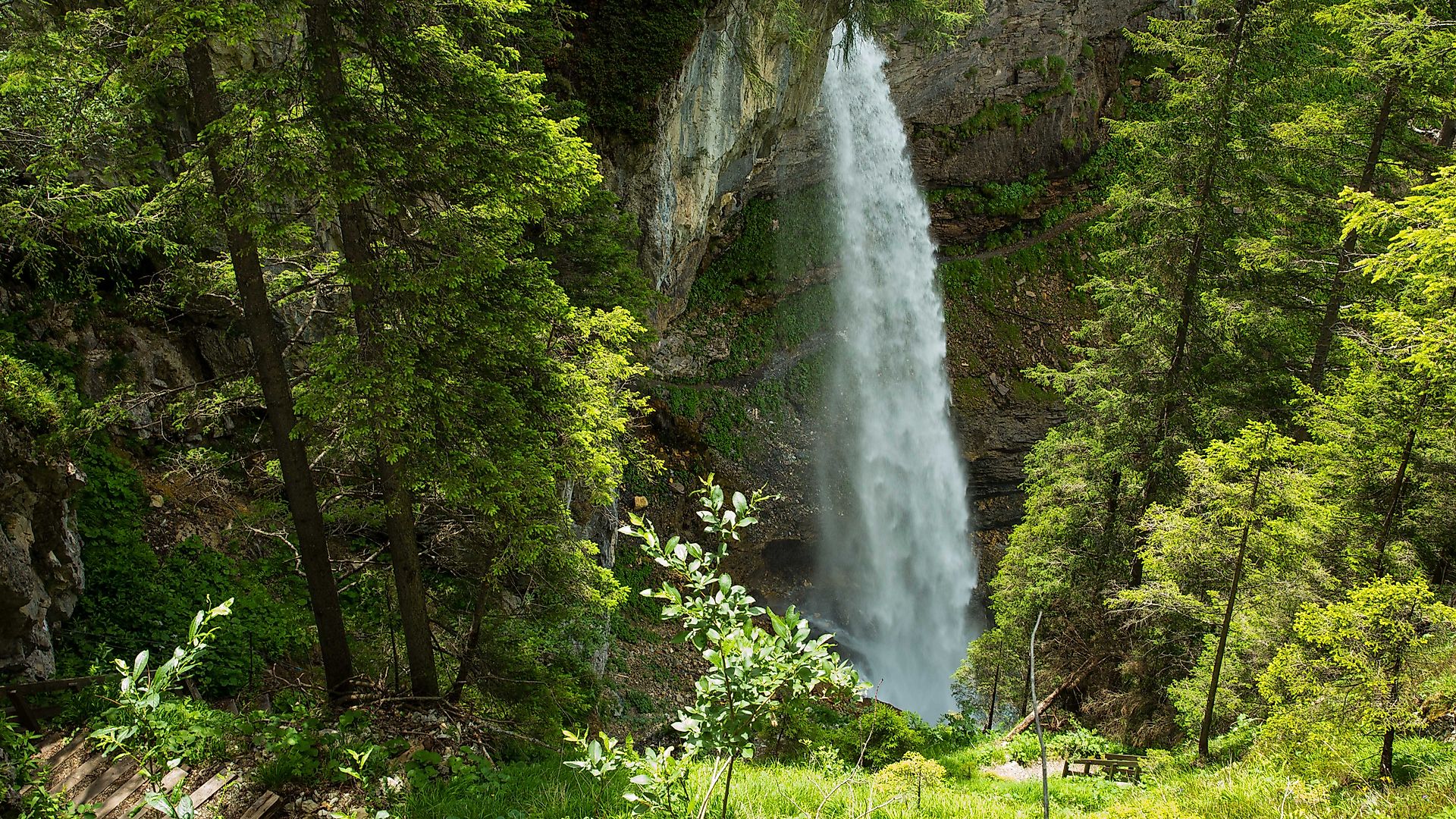 Das erste und sicherlich sehr beeindruckende Erlebnis wird heute der Johanneswasserfall sein. Ich freue mich schon riesig darauf, dieses Naturschauspiel endlich wieder einmal aus der Nähe zu sehen! Wir wandern vom Ausgangspunkt ca. 10 Minuten bis wir den Wasserfall erreichen. Vorsichtig steigen wir die feuchten Holzstufen hinab und bald zeigt sich der Johanneswasserfall in seiner ganzen Pracht. Wir staunen um die Wette und bewundern, wie das tosende Wasser 60 m in die Tiefe stürzt. Viele unter uns zücken das Handy oder die Kamera, um die imposanten Wassermassen in einem Foto festzuhalten. Sensationell cool finden viele von uns, dass wir hinter dem Wasserfall hindurchwandern. Dabei genießen wir noch ein bisschen die kühlen Tröpfchen auf unserer Haut. Es soll ja heute ziemlich heiß werden.