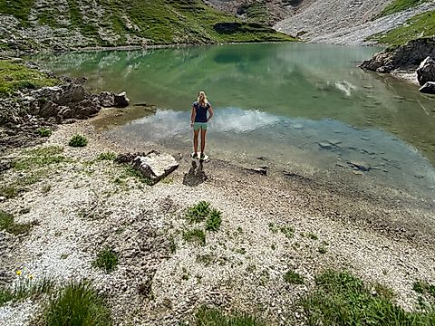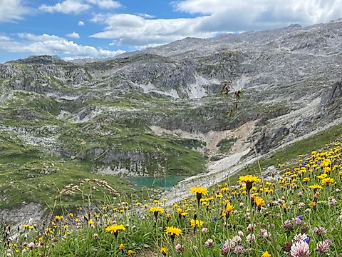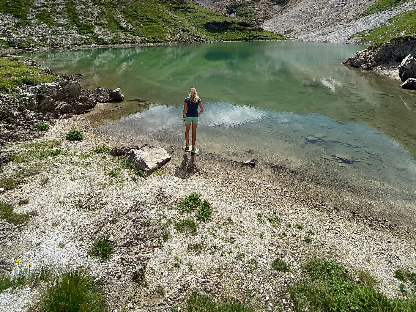 Im Abstieg versteckt sich in der Senke noch der Neukarsee, der sich für eine Abkühlung ideal anbietet. Klares, tiefblaues Wasser wie in der Karibik inkl. Trinkwasser Qualität. Spannend auch, dass die komplette Wasserversorgung von Flachau vom Gebirgszug des Faulkogel stammt.