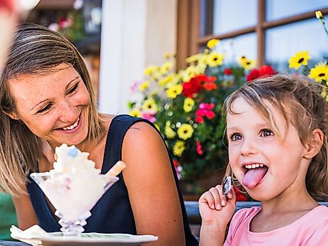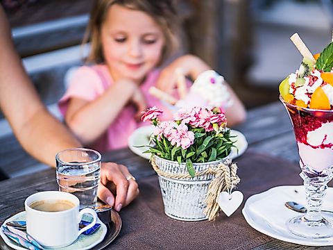 Jetzt wird’s aber erstmal Zeit für’s Mittagessen auf der herrlichen Sonnenterrasse, mit bodenständiger und herzhafter Küche. Als Belohnung gibt's anschließend natürlich noch einen groooooßen Becher Eis!
