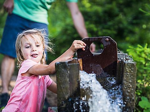 Nach kurzer Zeit geht’s wieder los, vorbei an dem Wasserrad, der nostalgischen Schaukel und dem gruseligen Spinnennetz zur Kletterwand, wo die Kids ihre Geschicklichkeit unter Beweis stellen können!