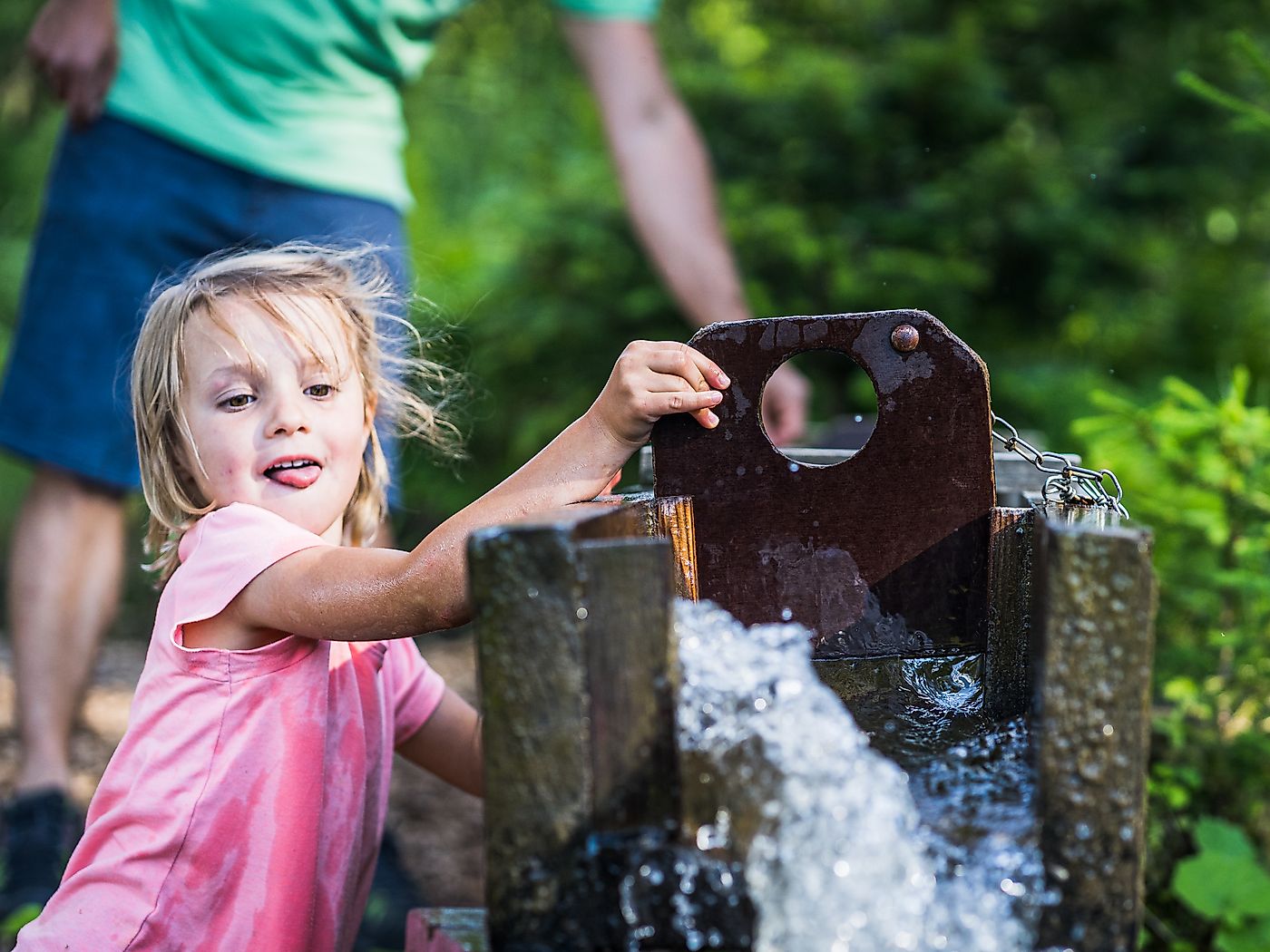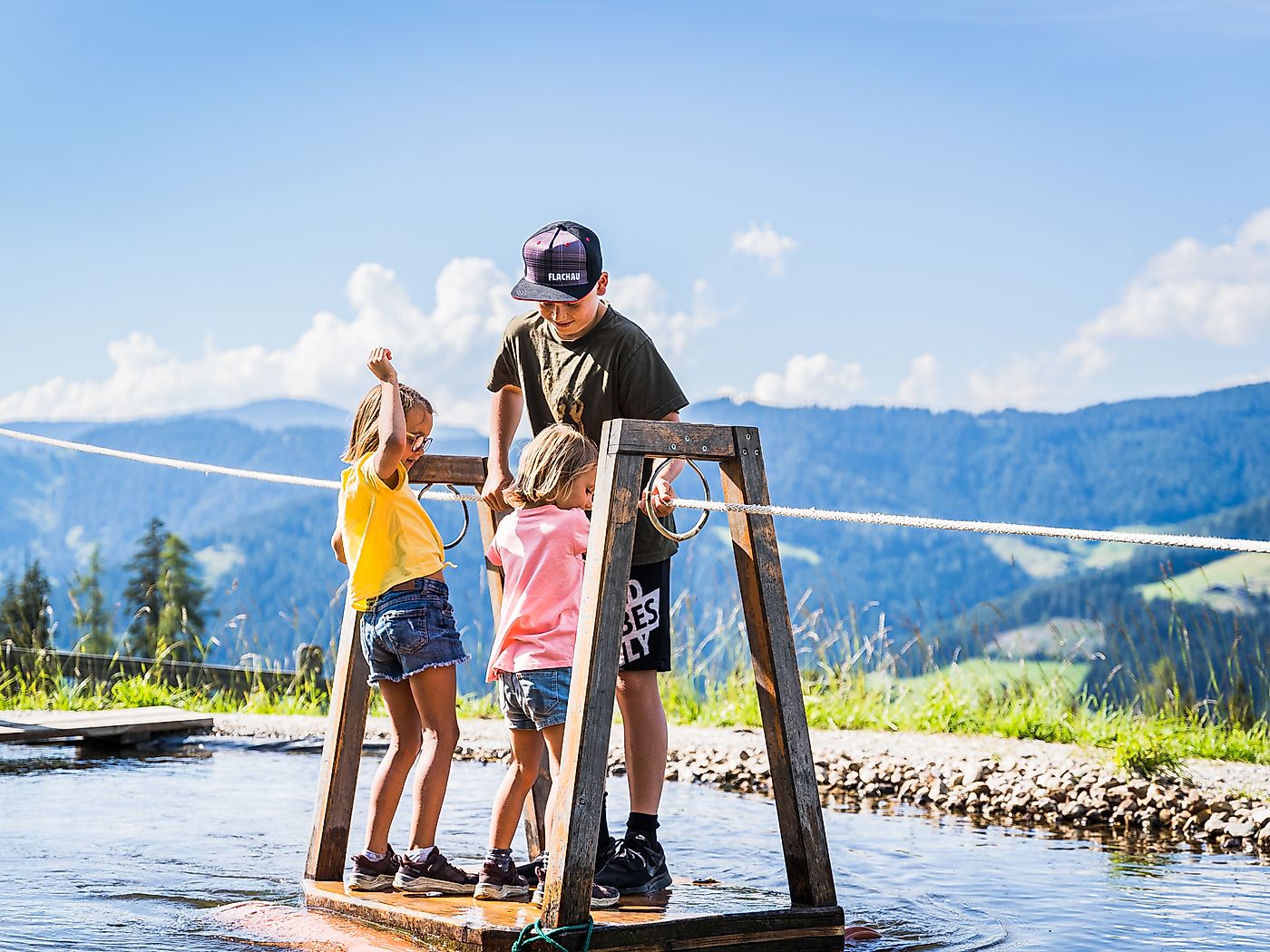 Vom Flying Fox geht es durch den zauberhaften Fabelwald in Richtung kühle Kneippanlage zum Holzfloss, wo sich die Kinder selbst von einem Ufer zum anderen befördern können. Perfekt, an so warmen Sommertagen wie dieser.