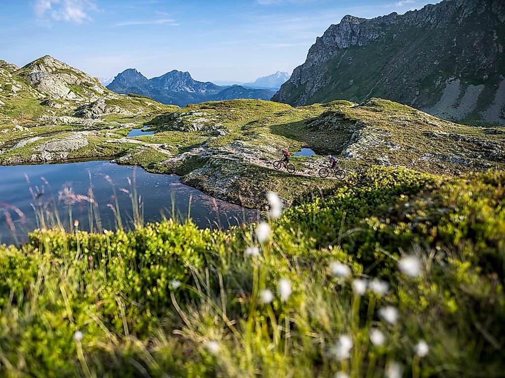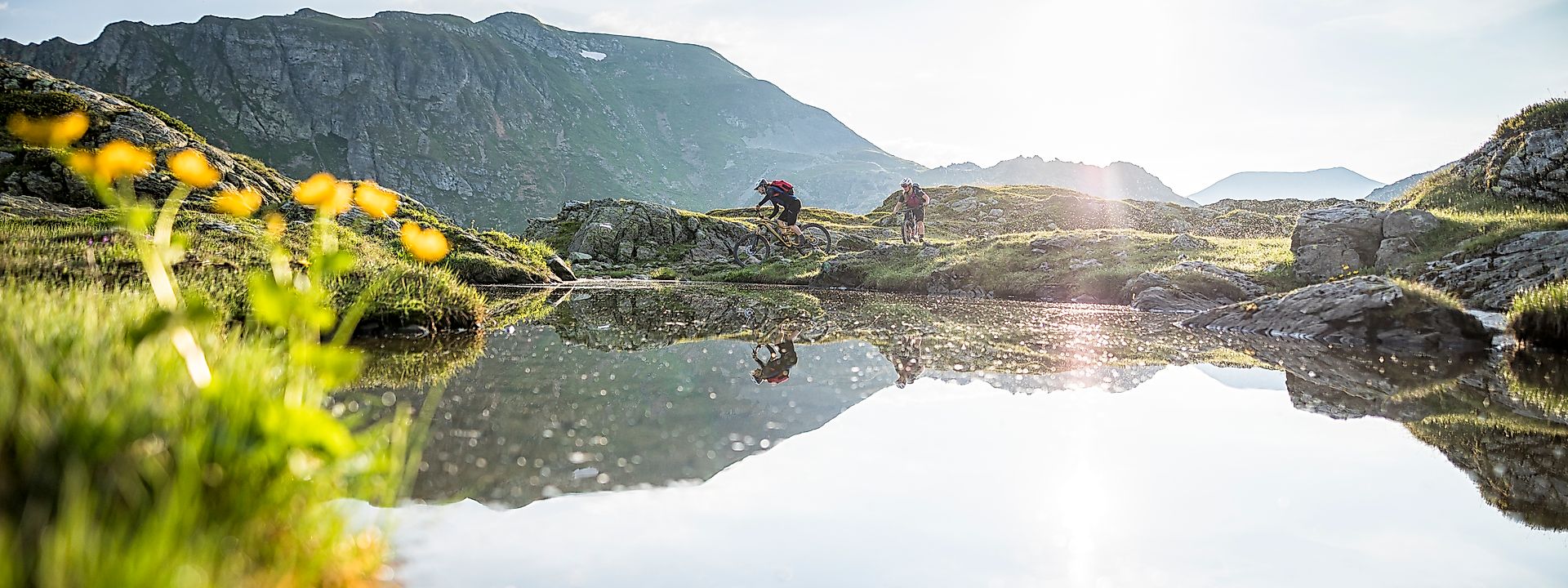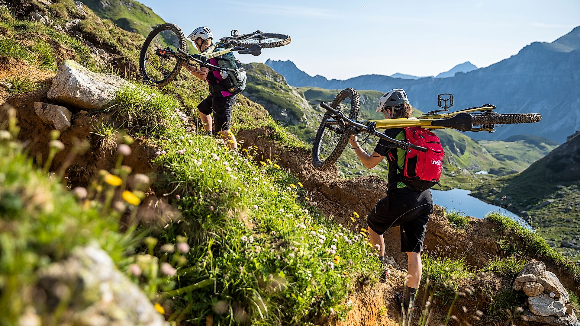 Eine Abkühlung im Badesee in Eben hätte sicherlich seinen Reiz gehabt, aber schließlich hält der Stoneman Taurista mit dem Anstieg zum Rossbrand – inkl. längerer Schiebepassage noch eine ziemliche Herausforderung an diesem Tag für mich bereit. Doch bei all der Anstrengung – das Panorama am Rossbrand ist unglaublich beeindruckend und lässt die Strapazen beinahe vergessen. Der Einkehr auf der Terrasse der Radstädter Hütte folgt ein flowiger Trail in Richtung Mandelberggut hinunter ins Tal.