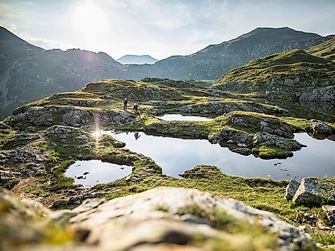 Nach unserer entspannten Pause auf der Oberhütte folgt der herausforderndste Teil der ganzen Tour. Die Überquerung der Tauern inkl. einer langen Tragepassage über den höchsten Punkt (2.110 m) wird uns noch einmal fordern. Hier ist die Natur noch um einiges karger und rauer aber auch imposant und faszinierend. Dank der herausragenden Aussicht war die Anstrengung aber nur Nebensache. Es geht vorbei an wunderschönen kleinen Bergseen und felsigen Steinwänden in atemberaubender Umgebung. Der Ausblick auf die Lungauer Kalkspitze, das Mosermandl und viele weitere markante Almgipfel ist einfach nur beeindruckend. Alle Anstrengung war plötzlich vergessen.