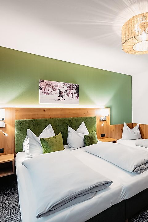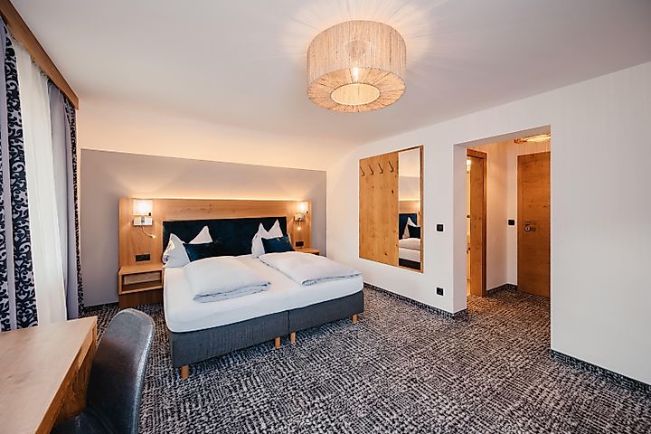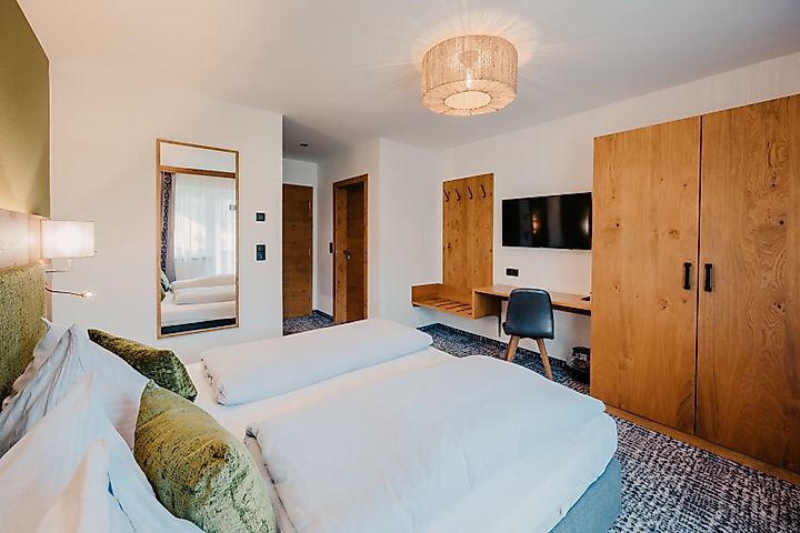 Unsere Zimmer sind hell, funktional und mit allem ausgestattet, was Sie brauchen: Dusche/WC, Flat-TV, kostenloses W-Lan, Safe und Balkon mit Blick ins Grüne oder auf die Berge.