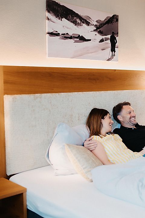 Unsere Zimmer sind hell, funktional und mit allem ausgestattet, was Sie brauchen: Dusche/WC, Flat-TV, kostenloses W-Lan, Safe und Balkon – mit Blick auf die verschneiten Berge oder die ruhige Natur.