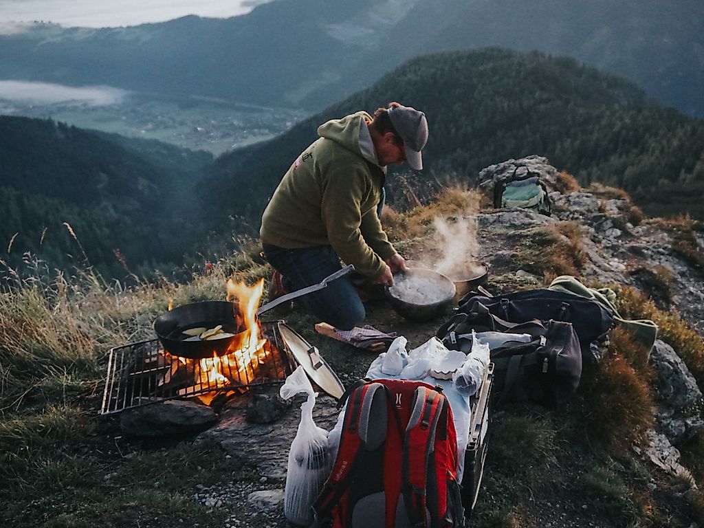 A few minutes later, the large cast-iron frying pan is placed on the fire and Jaggi sets about preparing breakfast. There is muas, a traditional local dish that was once prepared by alpine dairy farmers and woodcutters. It's not hard to see why: the mixture of flour, salt, water and clarified butter is quick to prepare, tastes good and provides a lot of energy for the day. Just what hikers need, I reckon. "Energy food", Jaggi tells us with a grin. Nostalgia hits for some of my fellow climbers. "The last time I ate this was at my granny's", says Elisabeth, a born-and-bred native of Flachau. Jaggi's final touch to the muas is fresh bilberries. I take a plate, make myself comfortable between two rocks and tuck in. Delicious!