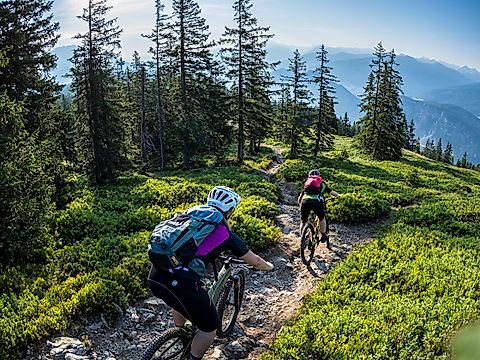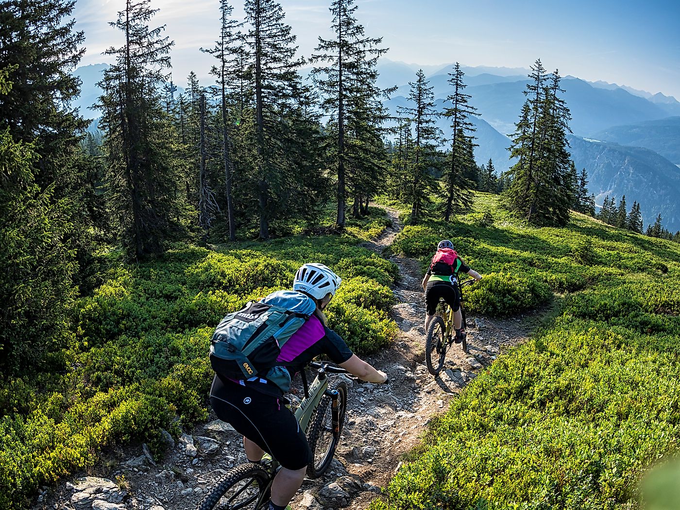 It would have been nice to cool off in the lake in Eben, but the Stoneman Taurista still has a considerable challenge in store for us today: an ascent of Rossbrand, including a long section where we need to push. But no matter how much effort it took, the amazing panoramic views from Rossbrand are almost enough to make you forget the hard work. We take a break on the terrace at the Radstädter Hütte hut before setting off again along a flow trail down into the valley towards Mandelberggut.